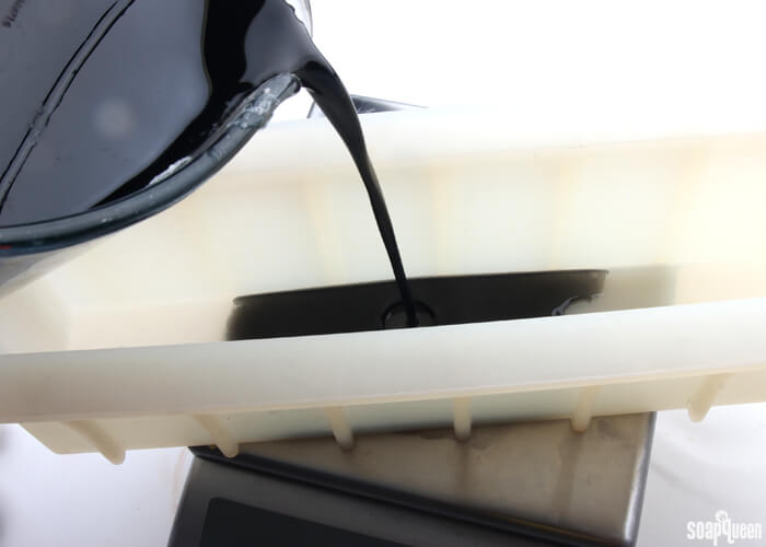 • Pour 8 ounces of the black soap into the mold, and spray with 99% isopropyl alcohol to disperse any bubbles. I recommend placing the mold on a scale to measure the amount of soap being poured exactly. This well help create even layers. Allow the layer of soap to cool and harden until a thick skin has formed, or until it’s completely hard.