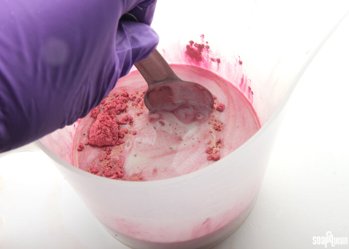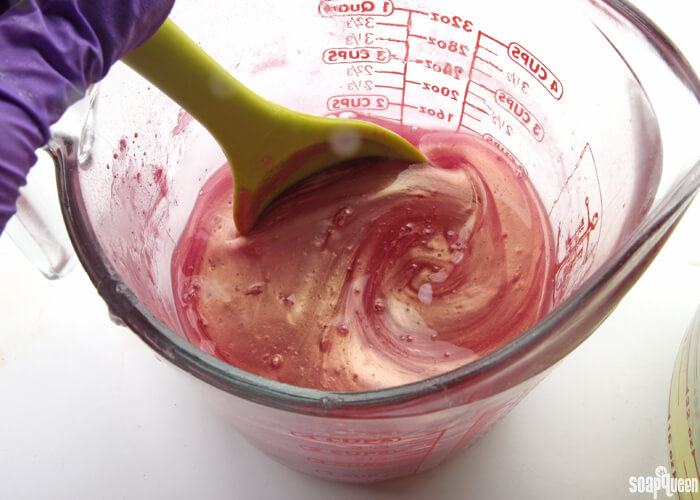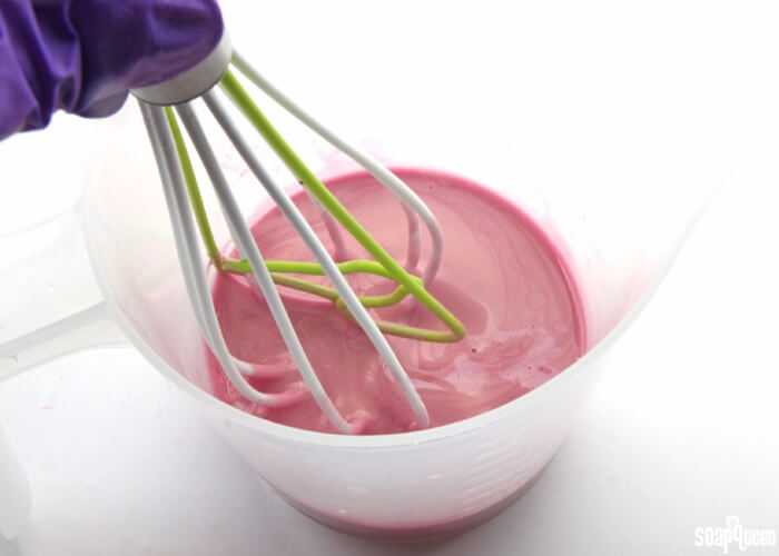 • Disperse 2 teaspoons of Rose Gold Mica into 2 tablespoons 99% isopropyl alcohol. Pour off 16 ounces of the clear melted soap into a separate container and add all the dispersed mica. Use a spoon or spatula to fully mix in. Set aside.
