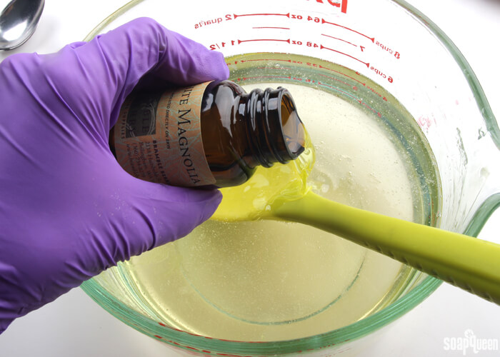 EMBEDONE: Chop and melt 50 ounces of Clear Melt and Pour in a large bowl in the microwave using 30 second bursts. Once completely melted, add the White Magnolia Fragrance Oil. Use a spoon or spatula to completely mix in the fragrance oil.
