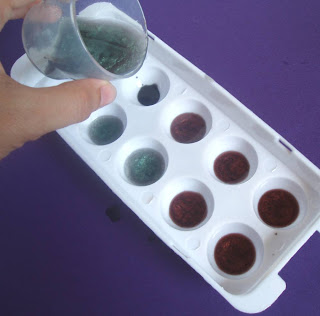 Step One: Melt 1 ounce of clear melt and pour and add 1-2 drops of liquid black colorant. Pour a dime sized drop into bottom half of the sphere mold (we used a little dropper). Spritz to get rid of the air bubbles and let cool.