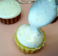 3. To make the frosting, melt the 4 oz of clear soap base in a medium mixing bowl. Stir in 2 tablespoons of liquid soap, a few drops of pink colorant, and any fragrance oil you like . Using a whisk or hand mixer, beat mixture until it forms soft peaks. Add 1 teaspoon of the Rainbow Sprinkles from the Sweet Treats kit. Mix until incorporated.