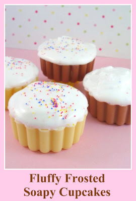 4. Spoon frosting onto soaps (turn soaps upside down so you’re frosting the backs), piling up as much as possible. Allow to air dry. It’s totally touchable and won’t crack! The frosting has a range of textures that you can achieve, from very soft peaks to dry, stiff peaks. It’s kind of like shaving cream. If you have added frosting to your soaps and you don’t like it, you can scrape it off, put it back in your bowl, and warm it up in the microwave again for 15 seconds. Mix again until you get a good texture. Try again and again – the frosting keeps re-fluffing! Sprinkle on extra sprinkles for added cuteness! Have fun! -Debbie, Soapylove