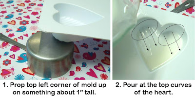 2. Melt 2 oz of white soap base. Spray mold with alcohol, then pour a small amount of soap into mold at the top curves of the heart, allowing soap to run down stripes and pool at one side. You only want total coverage of white soap over 1/2 of the design. Allow to harden.