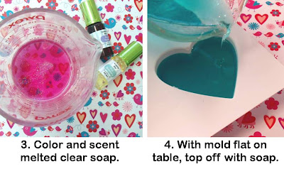 3. Melt 12 oz of clear soap. Color with 1 or 2 drops of any color from the Jewelry Box set (Fiery Fuchsia and Turquoise Blue are shown) and a sprinkle of Sparkle Dust. Fragrance with 2 dropper fulls of any scent from the Candy Jar set. Allow soap to cool to 120 degrees.