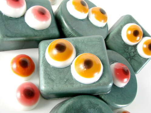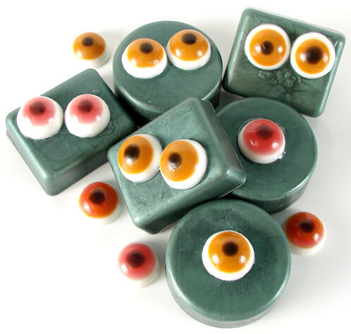 FIVE: Once all of the soap has cooled it’s time to “glue” on the eyeballs. Melt 1 oz of clear soap base. Dip the white end of the eyeball into the clear soap and quickly place it on the bar of soap. Repeat with the rest of your eyeballs. Let the clear soap cool and they’ll be ready for your spooky, Halloween gathering!