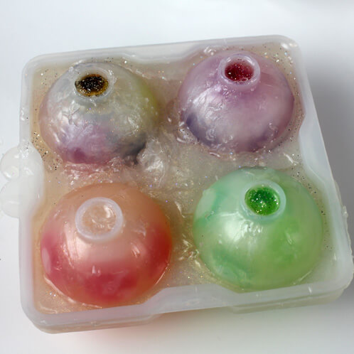 Their swirls and sparkles were always mesmerizing as they sat on the high-up shelf. I wanted to recreate that look, using our new 4 Sphere mold and of course, some shimmery mica and glitter! Eventually the embeds will bleed and create an even more swirly effect. If only I could figure out a way to make them actually bounce like the real thing. Kids love these bouncy ball soaps during bath time!