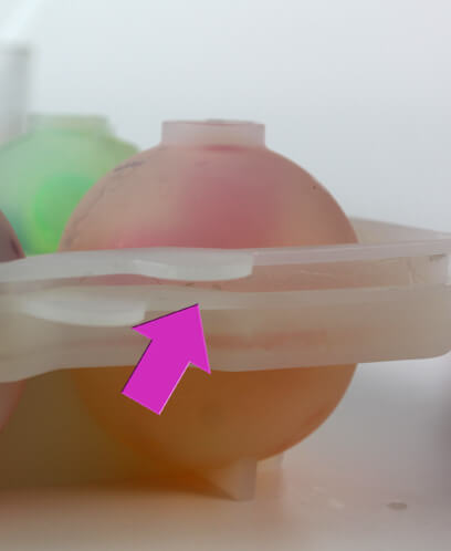 Fit the tops back onto the sphere molds, ensuring that there is a good seal between the two pieces around all of the cavities. If you can’t get a good seal, remove one of the balls. Shake the mold until all of the embeds have settled comfortably into the spheres. If you have embeds that are too close to the opening of the sphere mold, it can block the soap when you go to the next step.