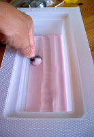 Melt 8 ounces of white soap. Let cool to 120 degrees. Spray surface of pink soap with rubbing alcohol and pour soap into mold. When soap is set but scoopable, make 3 more grooves like you did in the last step.