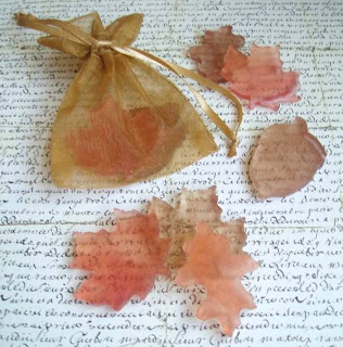 We decided on small marbled leaf shaped soaps presented in gold organza bags. Today I will tell you how to make them – they’re easy and very pretty! These would make very nice favors for a Thanksgiving dinner, too!