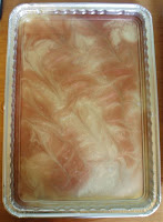 2. Holding one cup of soap in each hand, pour colors into pan, varying areas so they can marble. Use all of your soap. Take a popsicle stick and swirl the colors, creating a marbled effect. Stop when you like the design or a skin starts to form. Mist with alcohol to pop any surface bubbles.