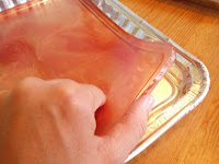 3. Allow to cool completely. After about 20 minutes, you should be able to peel back the pan and lift up the edge of the soap sheet with your fingers (in a rigid pan, you can pry up an edge with a butter knife).
