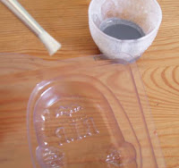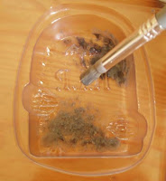 1) In your small cup, melt 1/2 ounce of white soap base. Stir in a generous pinch of black oxide. It won’t dissolve completely, but the lumps will give your texture more dimension.2) Take your stencil brush and dip into soap. Dab soap into mold, creating a rough texture. It can be really random and sloppy since it’s good to have some light areas and some heavy areas.