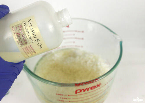 ONE: In a large heat-safe container, mix together the cera bellina wax, olive oil, hazelnut oil, castor oil and vitamin E oil. Melt on 45-second bursts and stir often until the wax is melted.