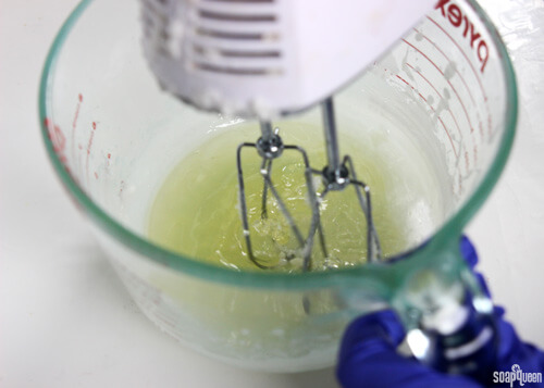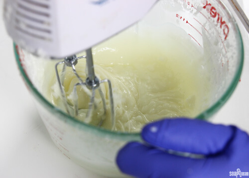 THREE: Using a hand mixer or stand mixer, begin whipping the mixture in the first container. When the wax starts to solidify, add 1 mL of the Cedarwood Essential Oil. Scrape the sides of the bowl and continue to whip. Whipping the mixture helps create a more spreadable product that is easier to apply.
