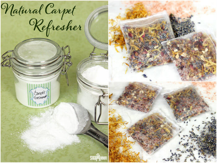 If your carpet or rug smells a little grungy, the Natural Carpet Freshener Tutorial is easy to make and quickly deodorizes. Made of baking soda, cornstarch, washing soda and essential oils, sprinkle the powder on the carpet. Allow the powder to sit for about 5-10 minutes, then thoroughly vacuum up the powder. To freshen up your clothing, the Natural Potpourri Squares bring the clean smell of lavender to small areas like drawers.