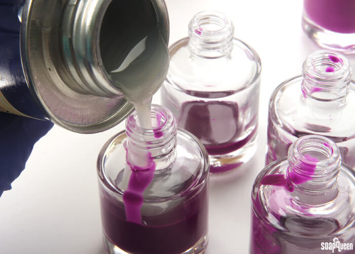 - Slowly and carefully, pour the Nail Polish Base into each bottle. Fill each bottle to the neck.