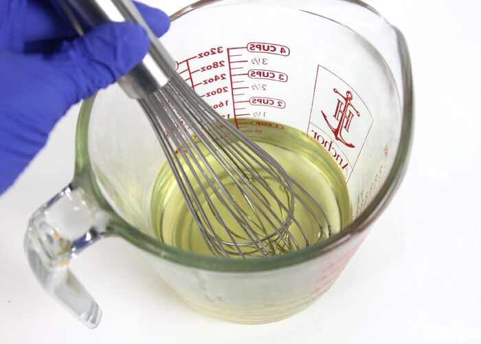 THREE: Use a whisk or spoon to blend together the oils and vitamin E oil. Heating the mixture helps blend the lighter and heavier oils more thoroughly.