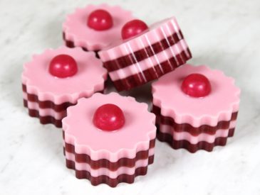 These tarts are all about the layers. Soap colored with Shimmer Merlot Sparkle Color Block and Shimmer Magenta Color Block is layered into the Silicone Scalloped Round Mold. Then, the soap is topped with a cute magenta embed. It smells delicious from the sweet and tart notes in the Red Berry Rhubarb Fragrance Oil.