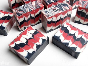 Red is a bit of a tricky color to achieve in cold process soap. When you add red colorants to a white batter, they tend to take on a pink shade. To create the vibrant red in this soap, I used a combination of Magenta Mica, Merlot Sparkle Mica and Sunset Orange Mica. On its own, Magenta Mica has a pink shade. The Merlot Sparkle Mica deepens the color, and the Sunset Orange Mica helps get rid of the pink hue. To see more red shades in cold process soap, check out the Quest for the “Perfect Red” in Cold Process Soap post.