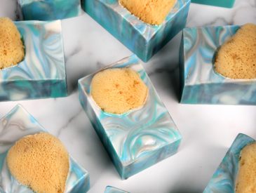 The bars are scented with Sea Salt Fragrance Oil. It’s a unique scent with notes of seaweed, cucumber water, and white tea leaves. It gives you plenty of time to create the swirls in this project and it doesn’t discolor.