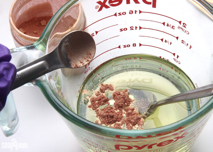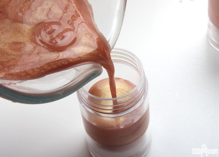• Add the Peach Shimmer Mica, and stir thoroughly to combine and get rid of any clumps. If you prefer more color and shimmer, feel free to add more until you are happy with the effect. To test the color, try the Spoon Trick!