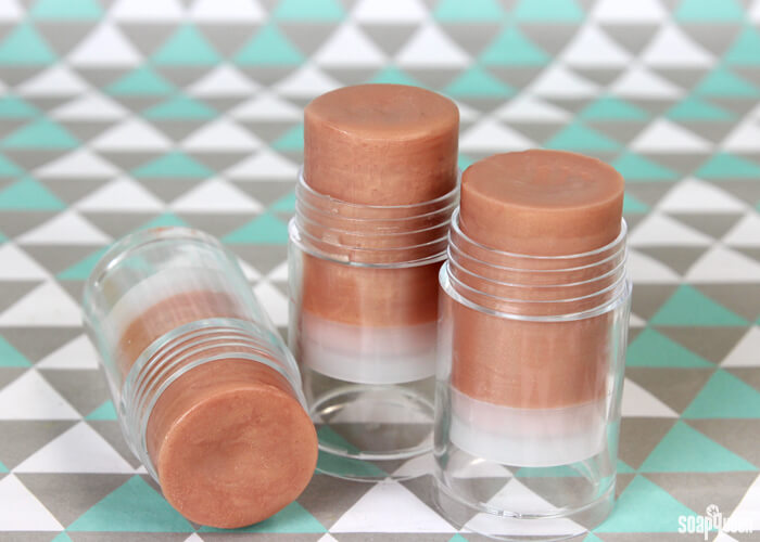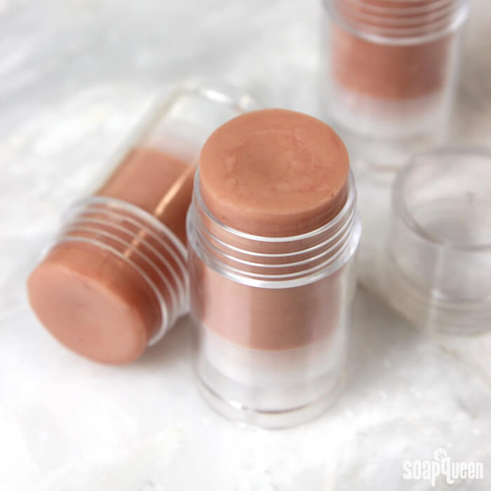 Once the mica is thoroughly mixed in, check the temperature of the mixture. You don’t want to pour the mixture while it’s too hot, or the mica may sink to the bottom. Once the mixture has cooled to about 130-140 ° F, carefully pour the mixture into the push tubes and allow to fully cool and harden. I found this filled 4 tubes up to the tip top, but this recipe would also comfortably make 5 tubes. Enjoy!