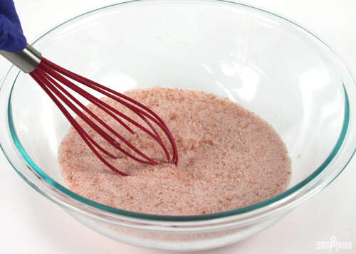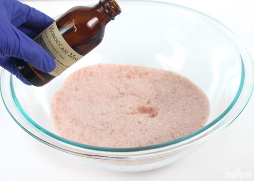 - In a large bowl, add 2 cups of extra small pink sea salt. Add 1 mL Moroccan Mint Fragrance Oil and stir to thoroughly incorporate.