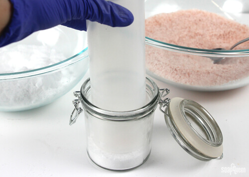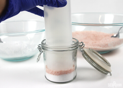 - Repeat this process, alternating between the pink and white salts until the jar is completely full. Once you are ready to use, scoop out several tablespoons of bath salts into hot bath water and enjoy!