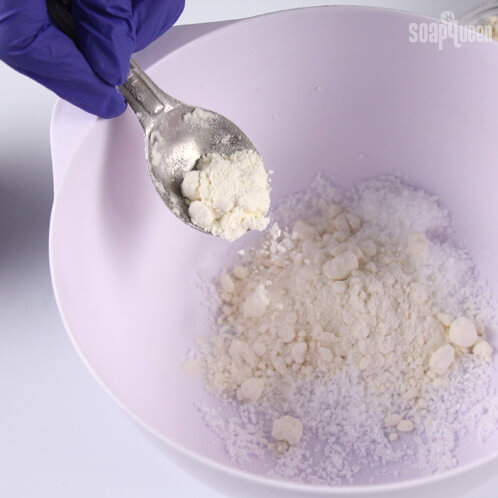 - Once the essential oil is fully mixed into the Epsom Salts, add the Powdered Goat Milk. It tends to clump up, so break it apart with your fingers and mix.