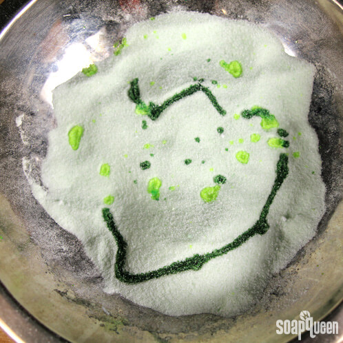 - Once the color has been fully incorporated into the salts, add the oil mixture. Be sure the salts are completely enveloped in oil and no salt chunks are present.