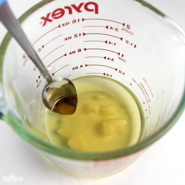 TWO: Melt 2 oz. of mango butter in a heat safe container on 30 second bursts. Microwaving on short bursts prevents the mango butter from getting too hot, which can cause graininess. If there are several chunks of mango butter in the mixture, stir until they melt.