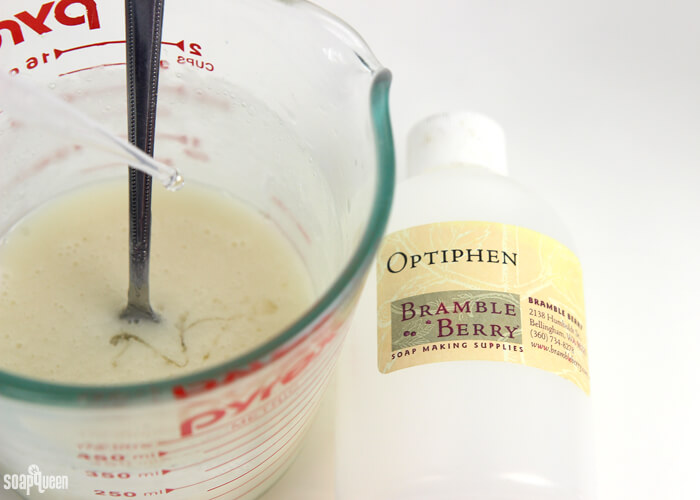 - Check the temperature of the mixture. If it is cooler than 176 F, add 8 mL of the Optiphen. If your scrub is warmer than 176 F, the preservative may not be effective. Note: Although this scrub doesn’t contain water, it will likely get water splashed in it during use. The extra water may cause bacteria and mold to grow. We added a preservative to be extra careful.