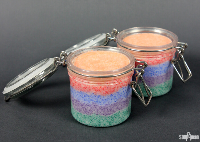 - Stir each color well and spoon into the bail jars. We layered green, purple, blue, red and orange, but you can choose any color order you like! Once the mixture is fully cooled, it's ready to use! Note: Spoon the mixture around the sides of the container rather than right in the middle. That will help prevent the scrub from sinking in the middle and will give you more even lines.