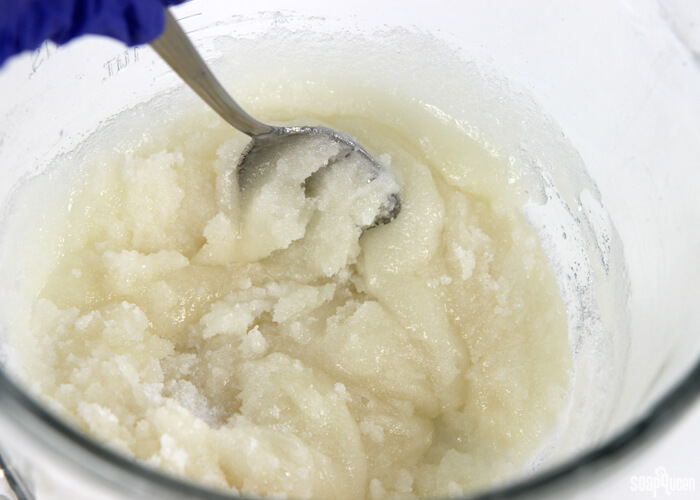 - In a separate container large enough to hold the entire mixture, measure out 12 oz. of sugar. Add the mango butter and potassium cocoate mixture and stir well.