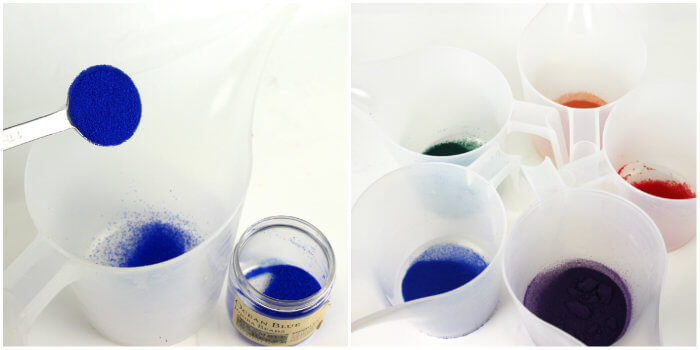 - Measure out 1 Tbsp. of each jojoba bead into five separate containers.