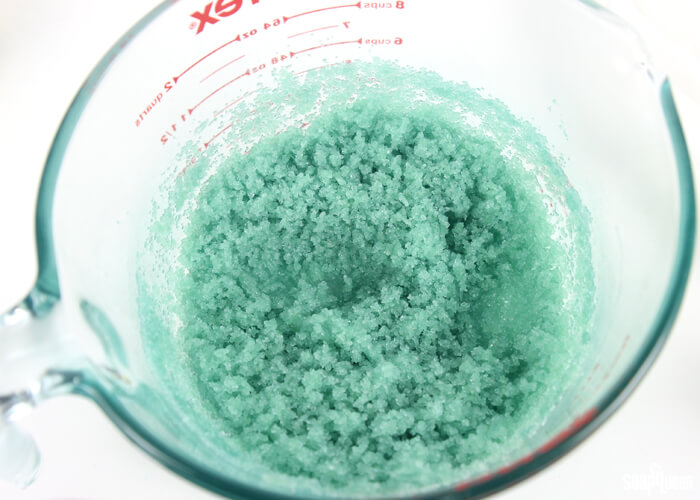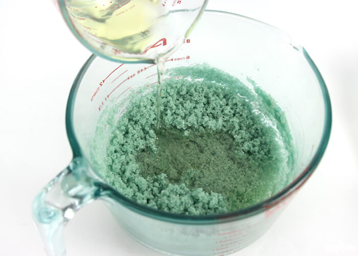 FIVE: In a separate container, measure out the Fine Grained Dead Sea Salt. Add 12 mL of diluted Blue Mix LabColor and 5 mL of diluted Emerald Mix LabColor. It may be difficult to mix in the LabColor at first. We found the best strategy was to put gloves on and hand mix the colorant into the salts. It’s very important to mix the LabColor into the salt first because the water-based LabColors will not mix into the oil-based scrub otherwise.