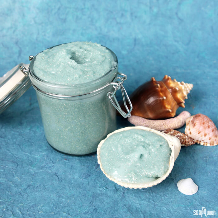 1) I saw you shared this recipe: https://soapqueen.com/bath-and-body-tutorials/cleansing-orange-spice-salt-scrub/ in one of your replies and I was wondering how I might be able to make this shimmering sea salt recipe look/feel more like the cleansing salt scrub? (keeping the aqua color/scent which is perfect for my shower theme but making it more of an exfoliating scrub and less oily)