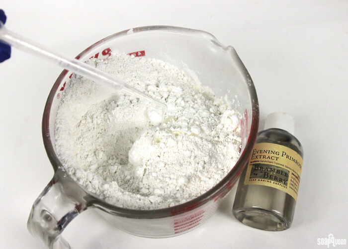 • Add 1.5 mL of vitamin E oil and 1.5 mL of Evening Primrose Extract and mix well. If you notice clumps forming, you can break them up with your hands or a whisk.