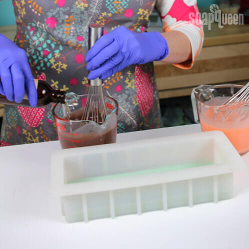 SIX: In the green soap, add about 1.2 oz. of Pikake Flower Fragrance Oil. Be sure to use a whisk or spatula to mix the fragrance into the soap. You don’t want to accelerate trace! Then, pour about 1/4 of the soap into the mold.
