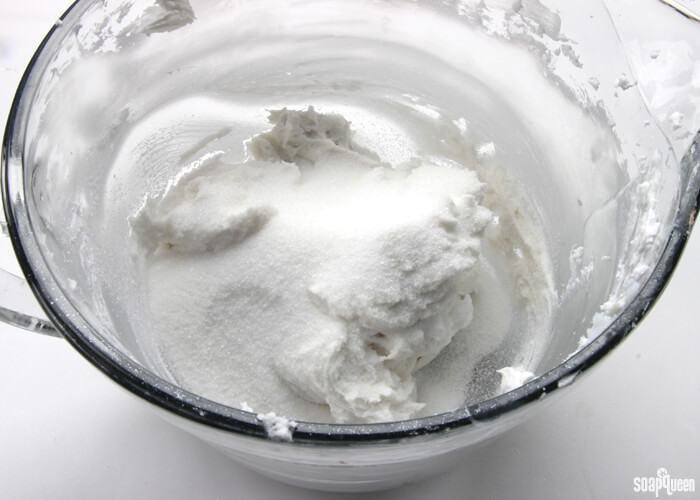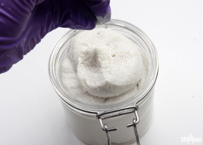 THREE: Add the Snowflake Sparkle Mica, Super Pearly White Mica, Fresh Snow Fragrance Oil and Spring Meadow Fragrance Oil. Use the mixer to blend until smooth. Be sure to start on a low speed so the mica does not “poof!” everywhere.