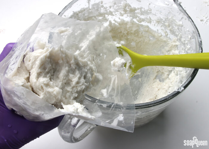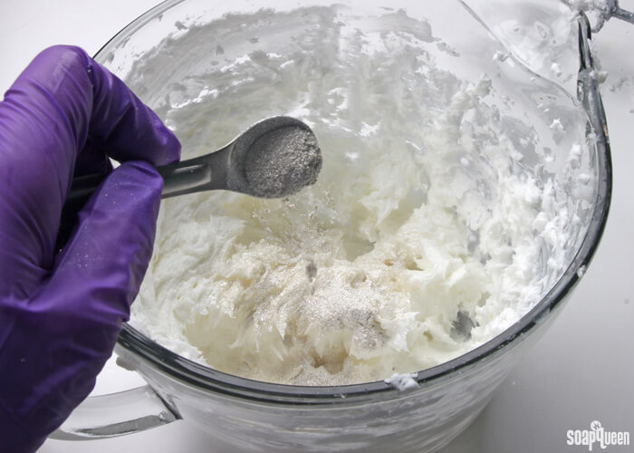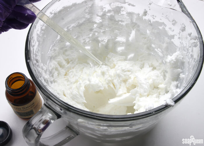 - Add the Snowflake Sparkle Mica, Super Pearly White Mica, Fresh Snow Fragrance Oil and Spring Meadow Fragrance Oil. Use the mixer to blend until smooth. Be sure to start on a low speed so the mica does not “poof!” everywhere.