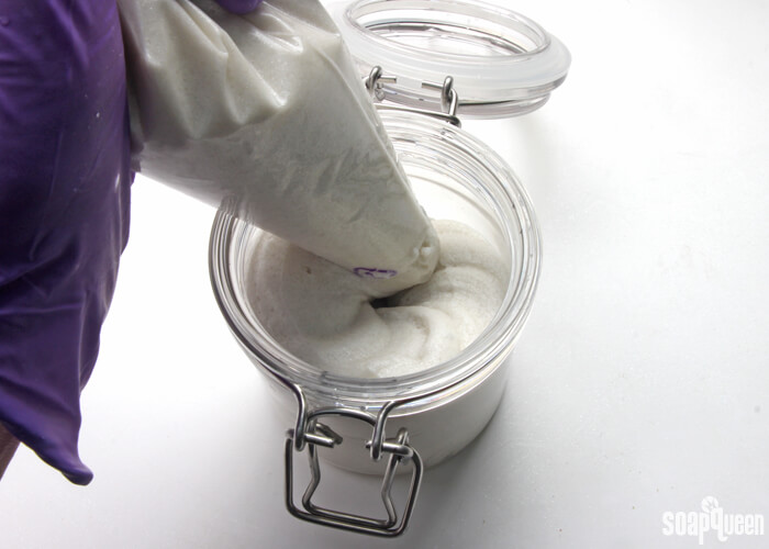 - Transfer the scrub into the plastic bail jars, or another container. For this scrub, I chose to place the scrub into a frosting bag, and pipe the scrub into the jar for a smoother look. This step is optional, but it really makes the scrub look polished and professional.