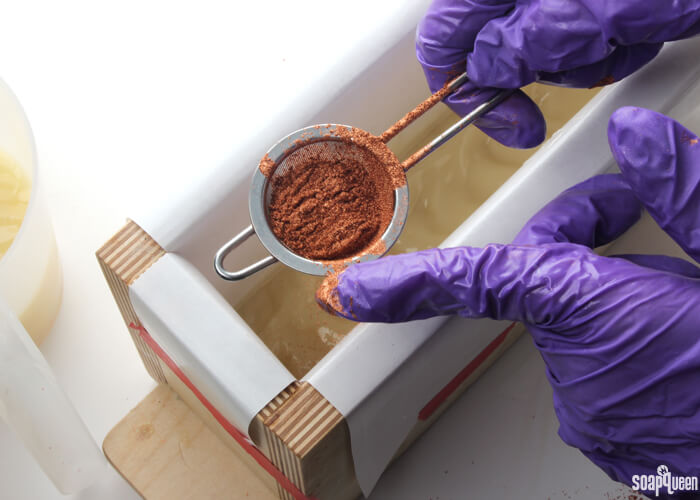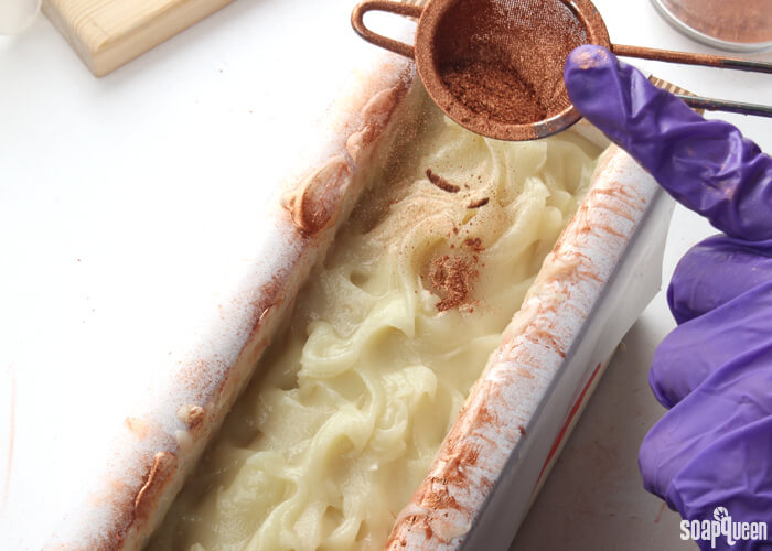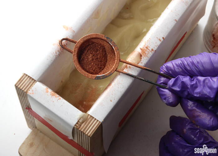 COLOR PREP: Have the Copper Sparkle Mica nearby. There is no need to disperse it with any oil, you will add the colorant to the soap dry. To help evenly sprinkle the mica onto the soap, a powder duster comes in handy!