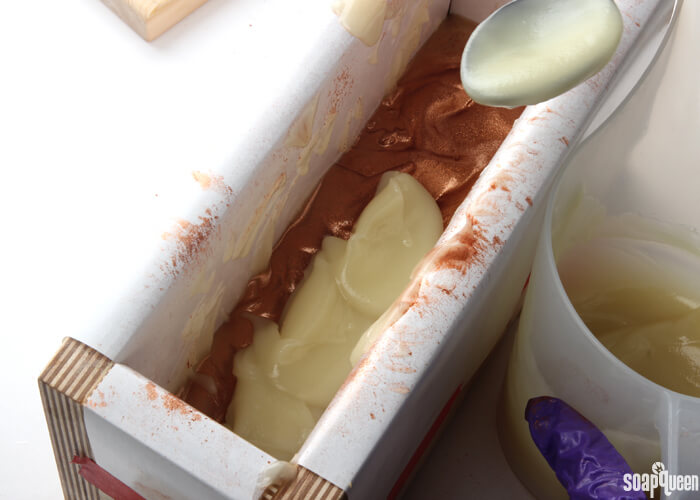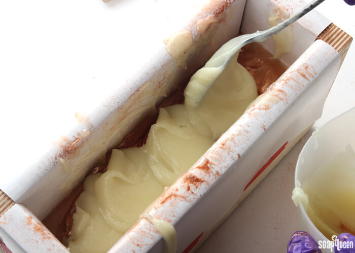 - Spoon another container of soap into the mold, on top of the Copper Sparkle Mica layer. Spread out the soap evenly throughout the mold, and create soft texture with the spoon.