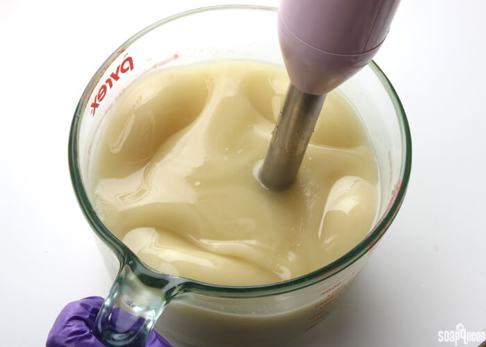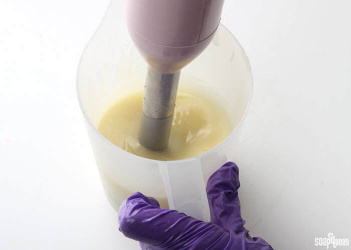 - Stick blend one of he containers until you reach a medium to thick trace. This will be the very bottom layer, so having a thick base will help support all the layers on top.