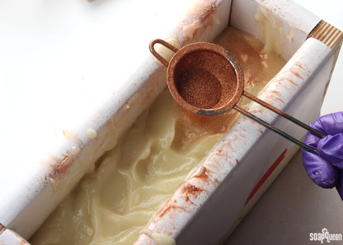 - Add another layer of Copper Sparkle Mica and blow gently. The entire layer of soap should be covered, but be careful not to add too much! Excess mica can cause the soap layers to separate once cut.