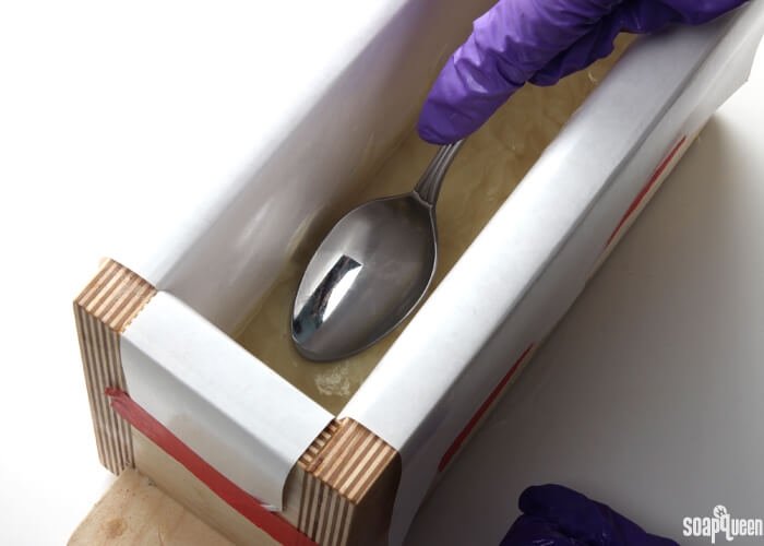 - Pour the thick soap into the mold, and firmly tap the mold onto the counter to help release any bubbles and disperse the soap throughout the mold. Use a spoon to spread the mixture, and create soft waves.