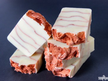 Sometimes the most stunning soap projects come from a simple design idea. This Spiced Copper Cold Process features layers of uncolored soap separated by lines of Copper Sparkle Mica. The top is then covered in the mica, creating a sparkly and slightly rustic look. This soap is scented with Spiced Amber Ale Fragrance Oil, which does not discolor in cold process soap. Read more about discoloration here. Having a non-discoloring fragrance oil is crucial for the mica lines to pop. If you choose a different fragrance oil for this project, keep that in mind!
