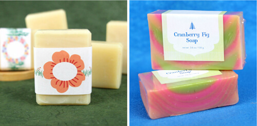 (Above, left to right) The Summer Cigar Bands completely transform the simple soap created using the Beginner’s Cold Process Kit. The colorful Funnel Pour Soap looks polished with both shrink wrap and soap labels.