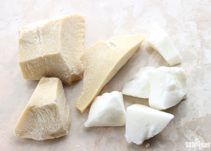 Some butters are soft and spreadable, while others are hard and brittle. In my opinion, the softest butters are avocado butter and coffee butter. They are soft, spreadable and melt on contact with the skin. Shea butter is slightly firmer, but still soft and spreadable. The two harder butters are mango butter and cocoa butter. Both are more brittle, and need to be chopped rather than scooped. Cocoa butter is much firmer than mango, and is great for adding firmness to cold process soap. Do you have a favorite butter?